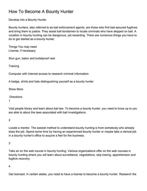 Other requirements include: A valid state drivers license. What are you looking for? Get a 7 day trial for $1. WebTo be employed in bounty hunting, it is necessary that the person learns the laws of the state in the matter so that no illegal actions are made in the middle of the process.